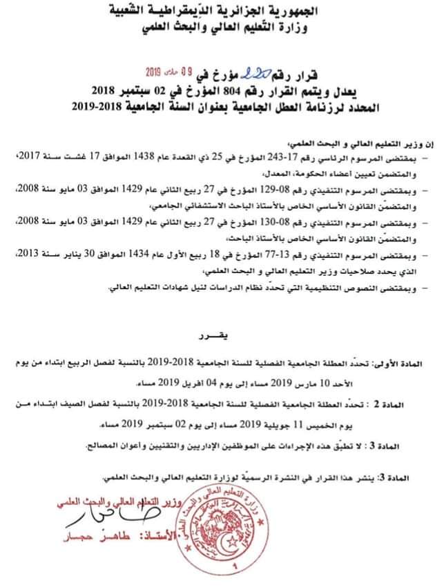 بناءا على القرار الوزاري رقم 220 المؤرخ في 09 مارس 2019 المعدل والمتمم للقرار رقم 804 المؤرخ في 02 سبتمبر 2018 المحدد لرزنامة العطل الجامعية بعنوان السنة الجامعية 2018/2019 فإن التاريخ الجديد لعطلة الربيع سيكون ابتداء من يوم الأحد 10 مارس 2019 مساءا إلى غاية يوم 04 أفريل 2019 مساء. لا تطبق هذه الإجراءات على الموظفين الإداريين والتقنيين وأعوان المصالح.