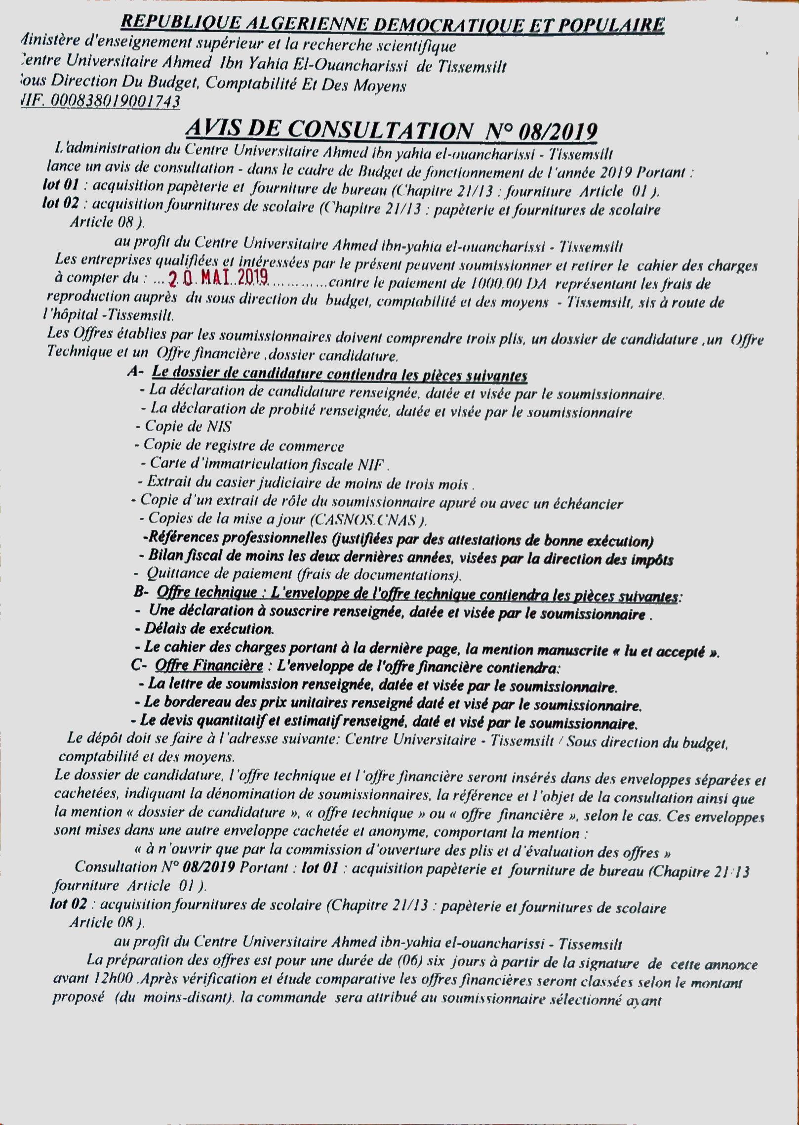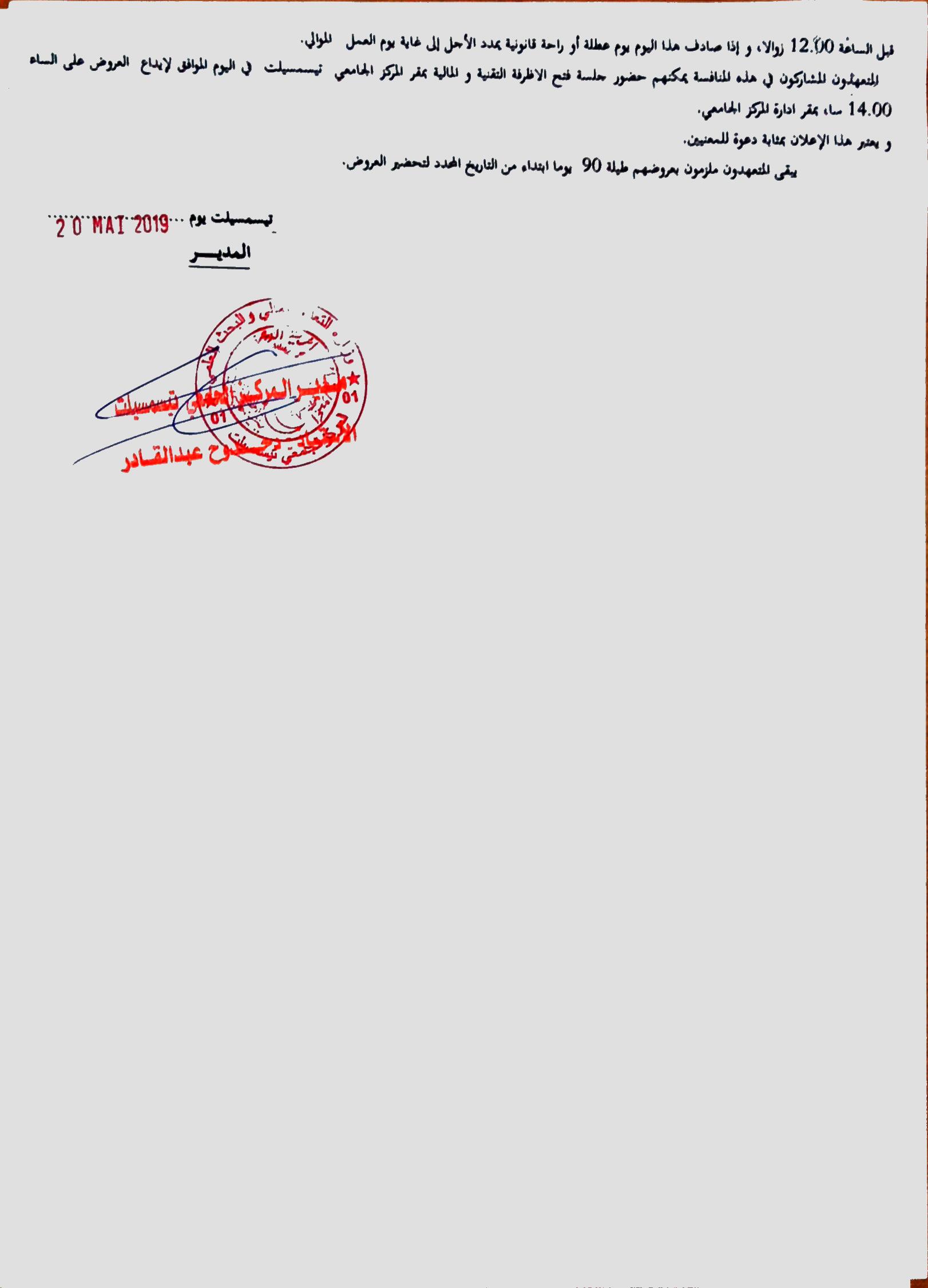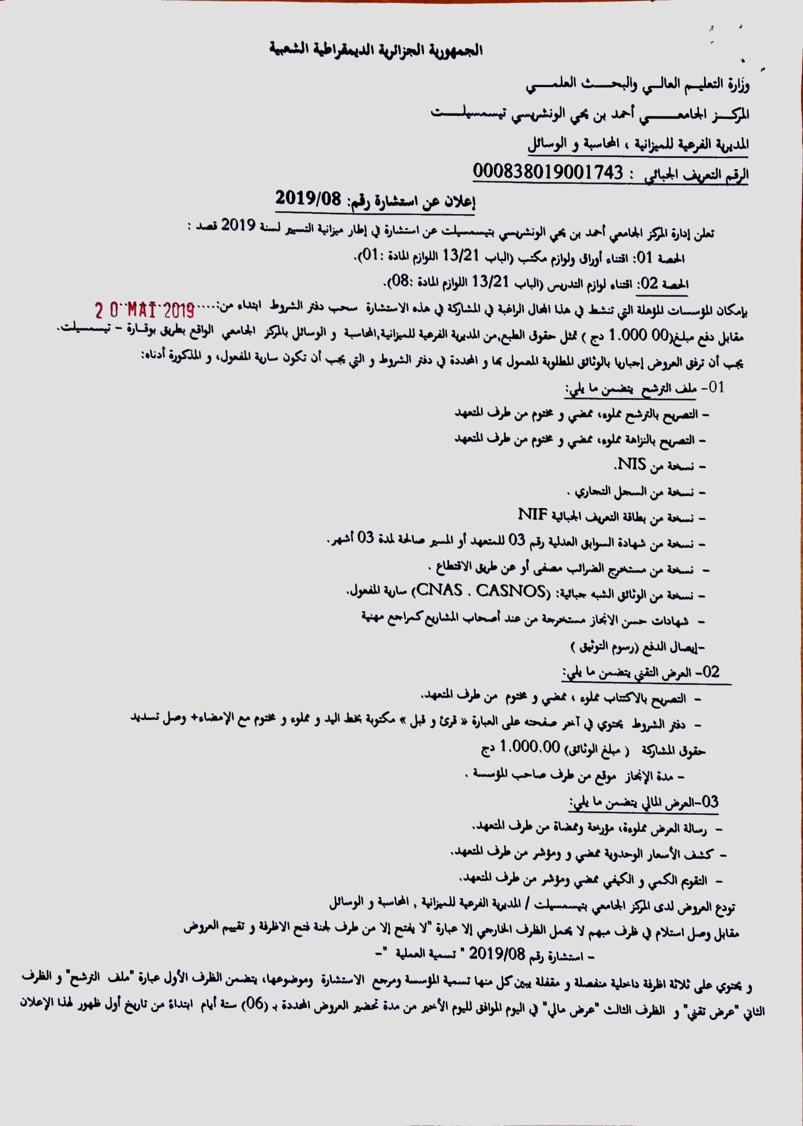 Avis de consultation N 08/2019 @إعلان عن مناقصات بواسطة admin آخر تحديث يناير 6, 2023 1٬107 شارك 1٬107 شارك FacebookTwitterGoogle+ReddItWhatsAppPinterestالبريد الإلكتروني