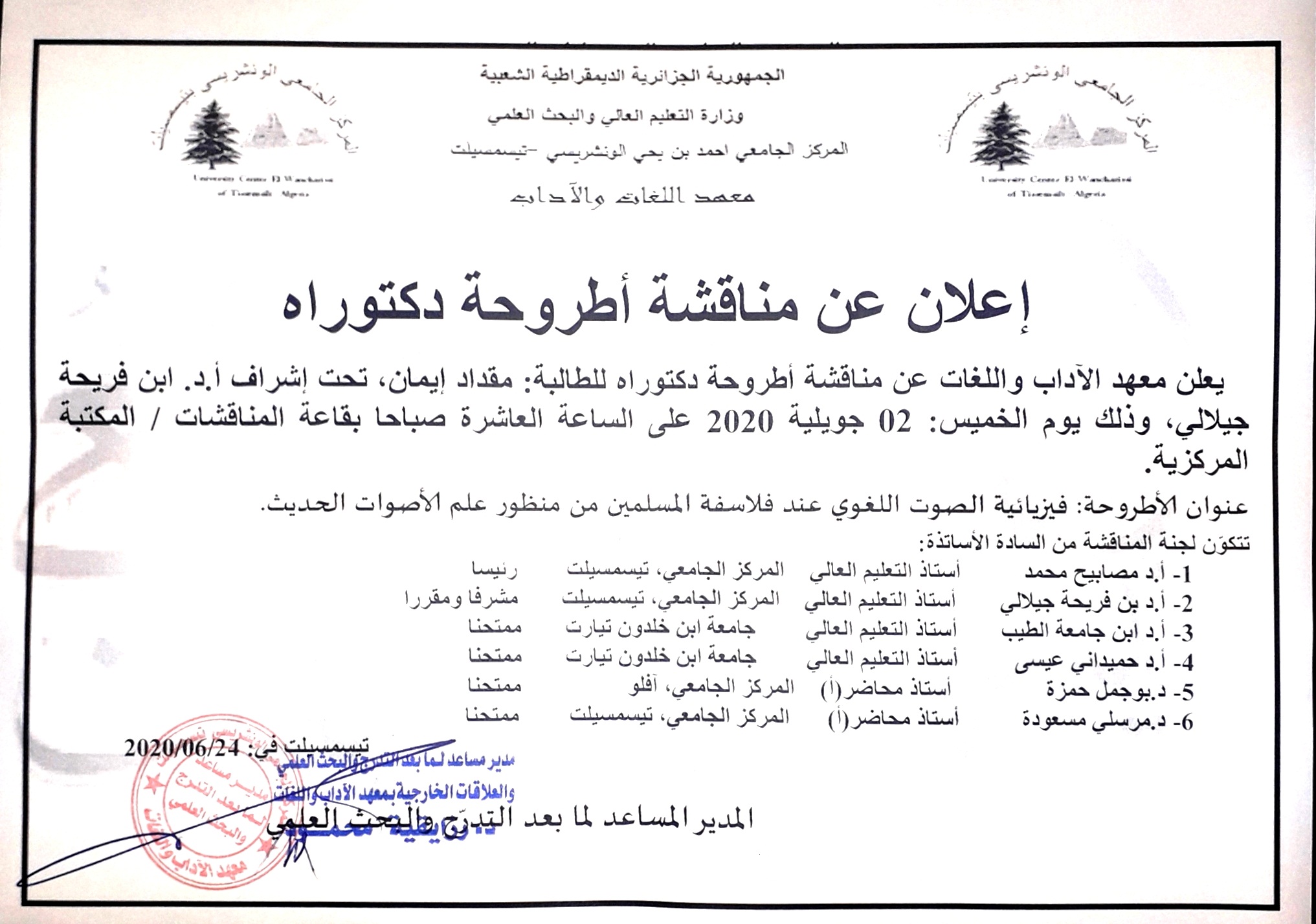 إعلان عن مناقشة أطروحة دكتوراه بمعهد الأداب و اللغات، قسم: الادب العربي، تخصص: دراسات لغوية بعنوان : " فيزيائية الصوت اللغوي عند فلاسفة المسلمين من منظور علم الأصوات الحديث @إعلان عن مناقشة أطروحة دكتوراه@إعلانات للأساتذة بواسطة admin آخر تحديث يناير 6, 2023 707 شارك 707 شارك FacebookTwitterGoogle+ReddItWhatsAppPinterestالبريد الإلكتروني