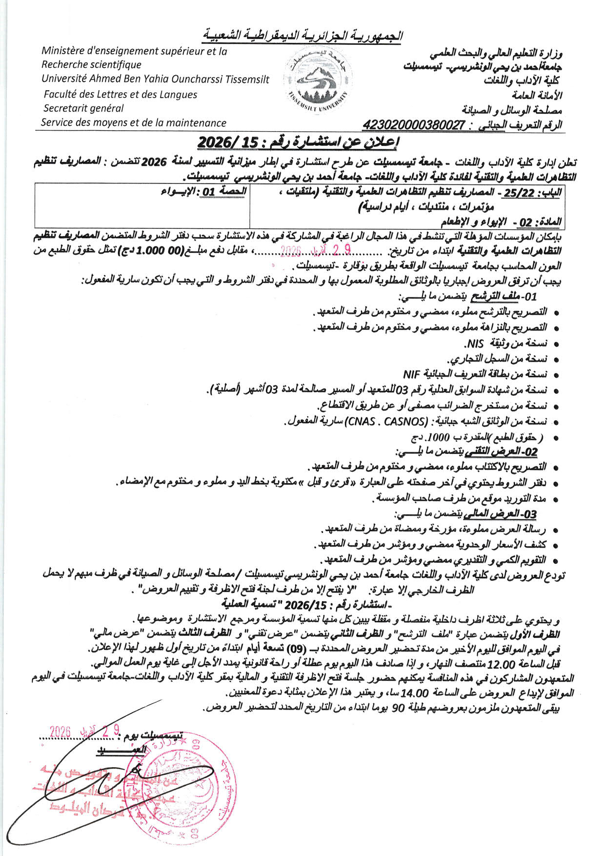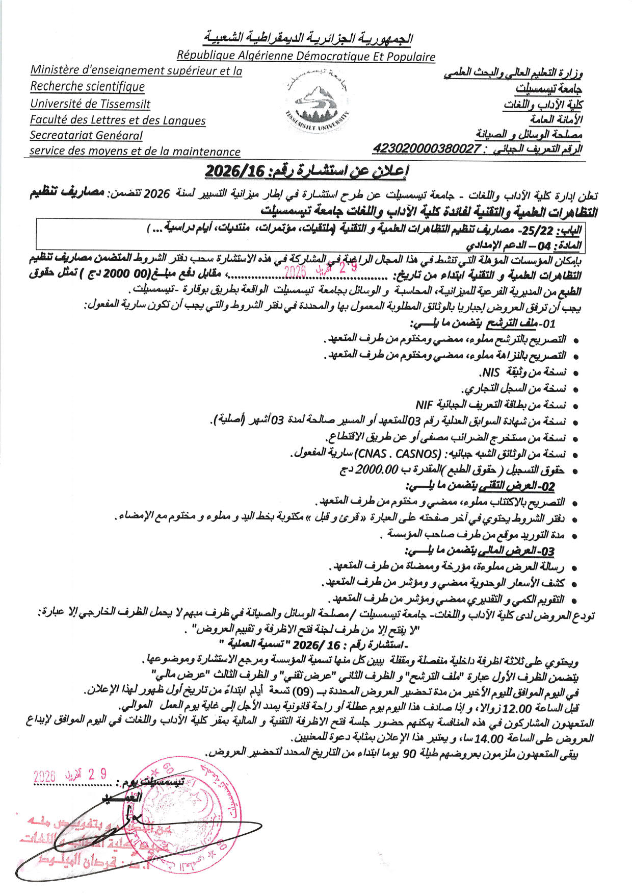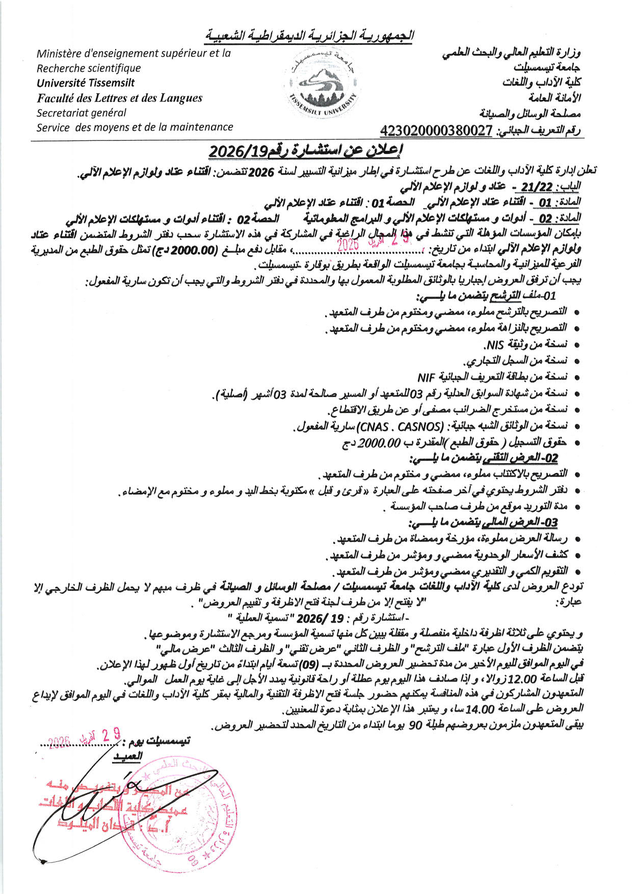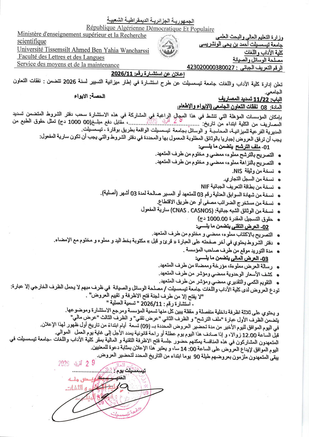 اعلان عن استشارة رقم: 11—2026/19 @إعلان عن مناقصات@التظاهرات العلمية و الثقافية بواسطة admin-ll آخر تحديث أبريل 30, 2026 3 شارك 3 شارك FacebookTwitterGoogle+ReddItWhatsAppPinterestالبريد الإلكتروني