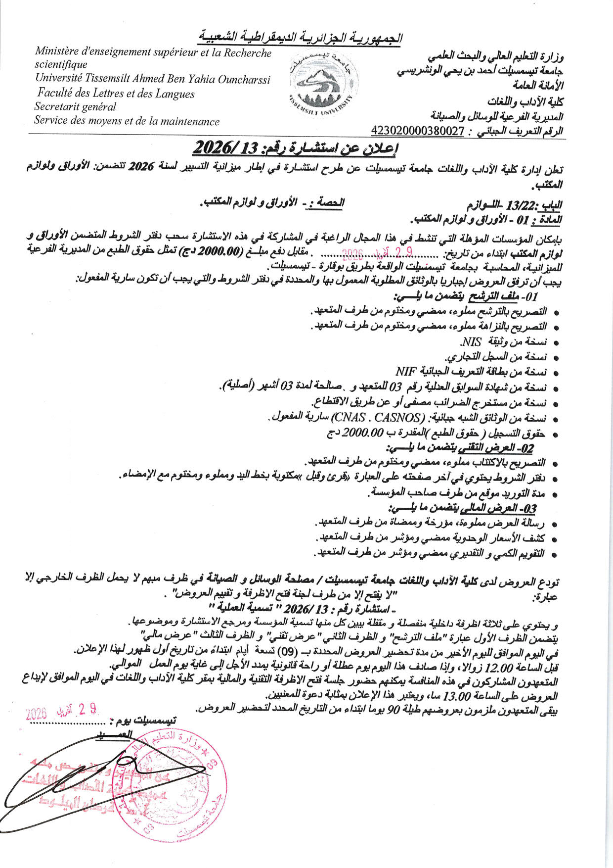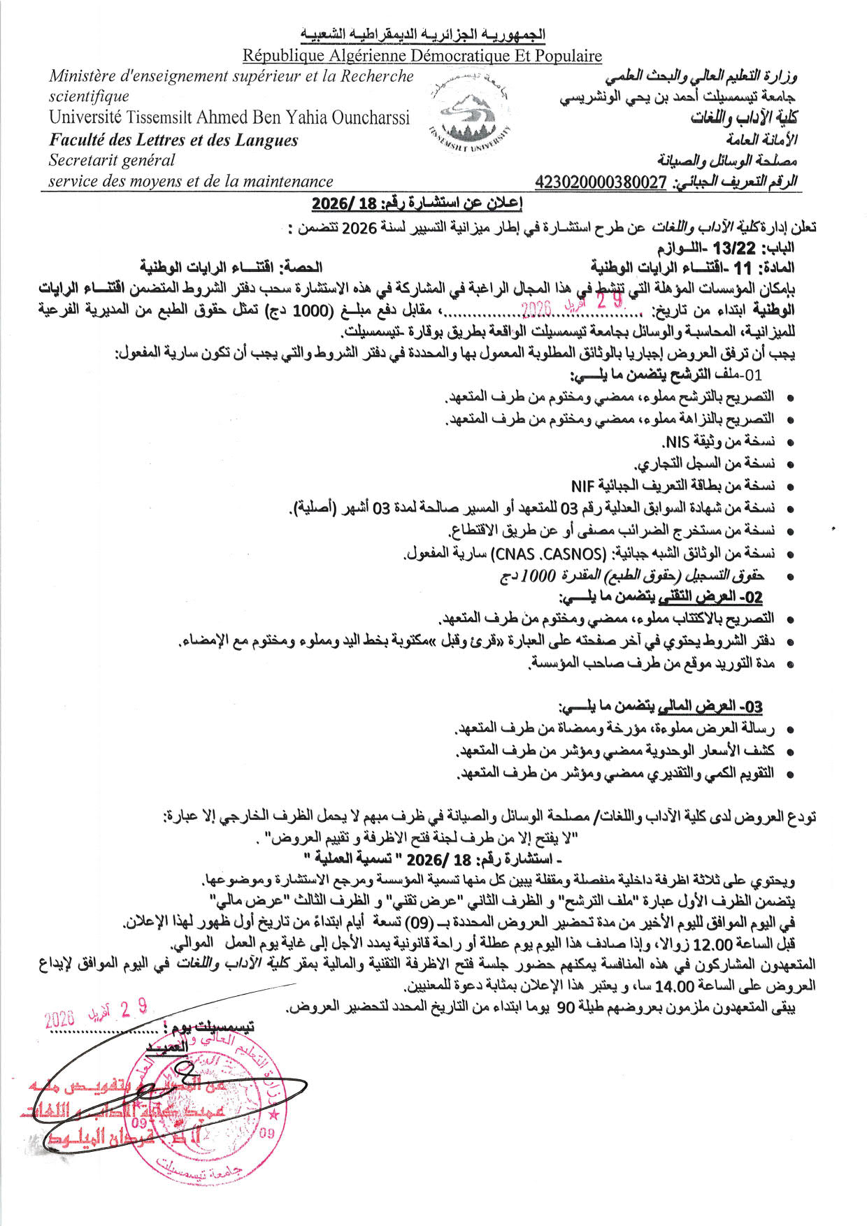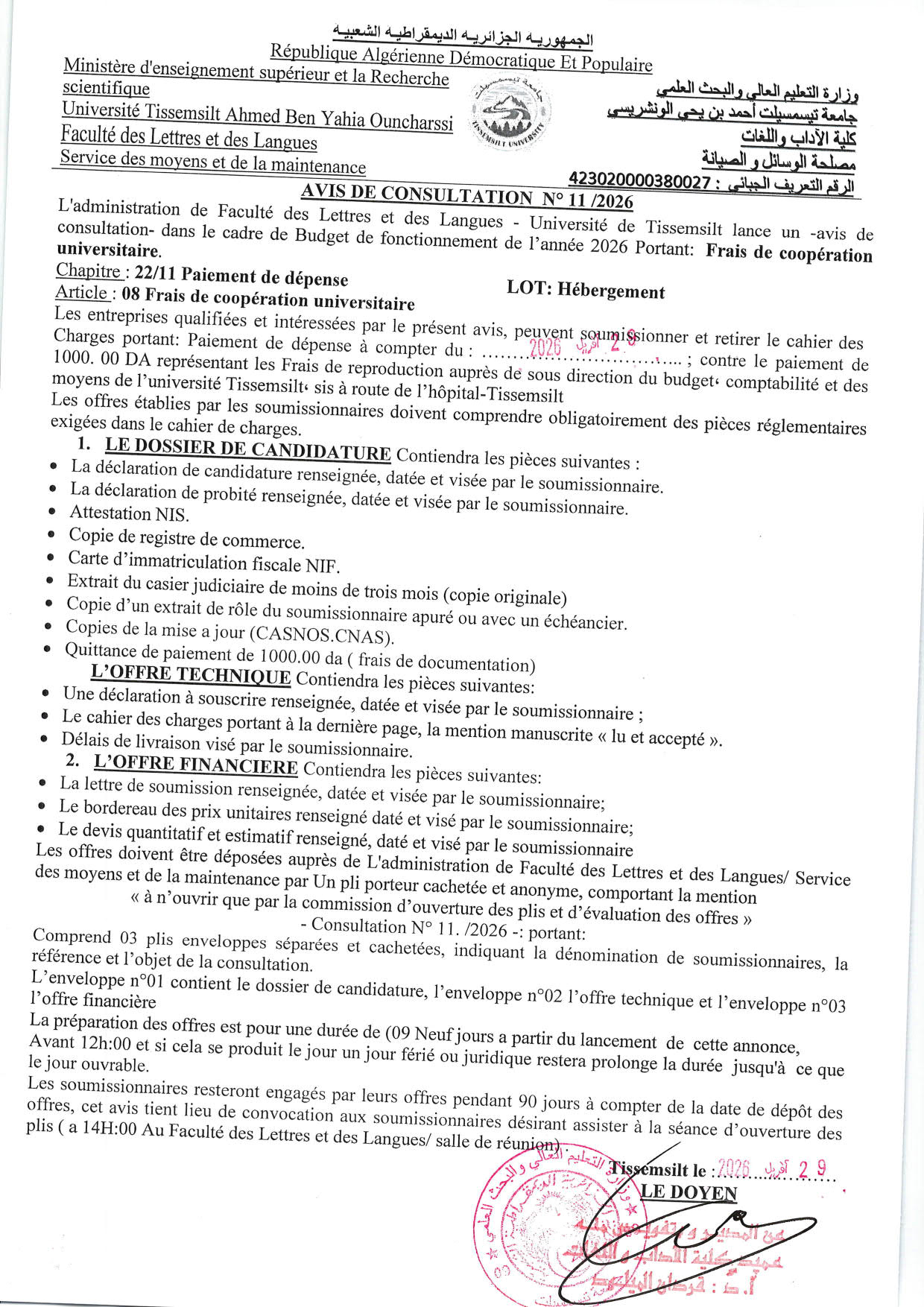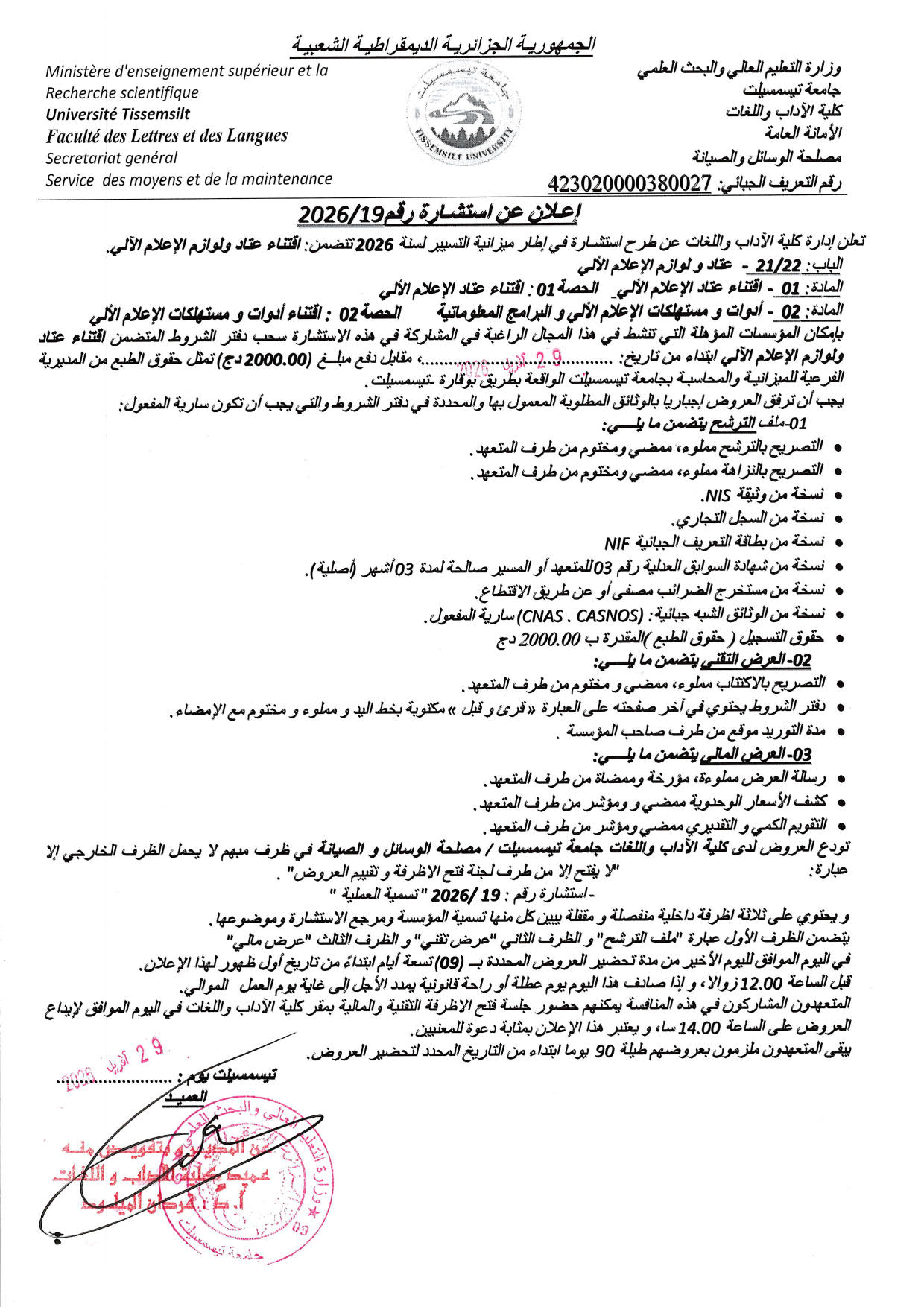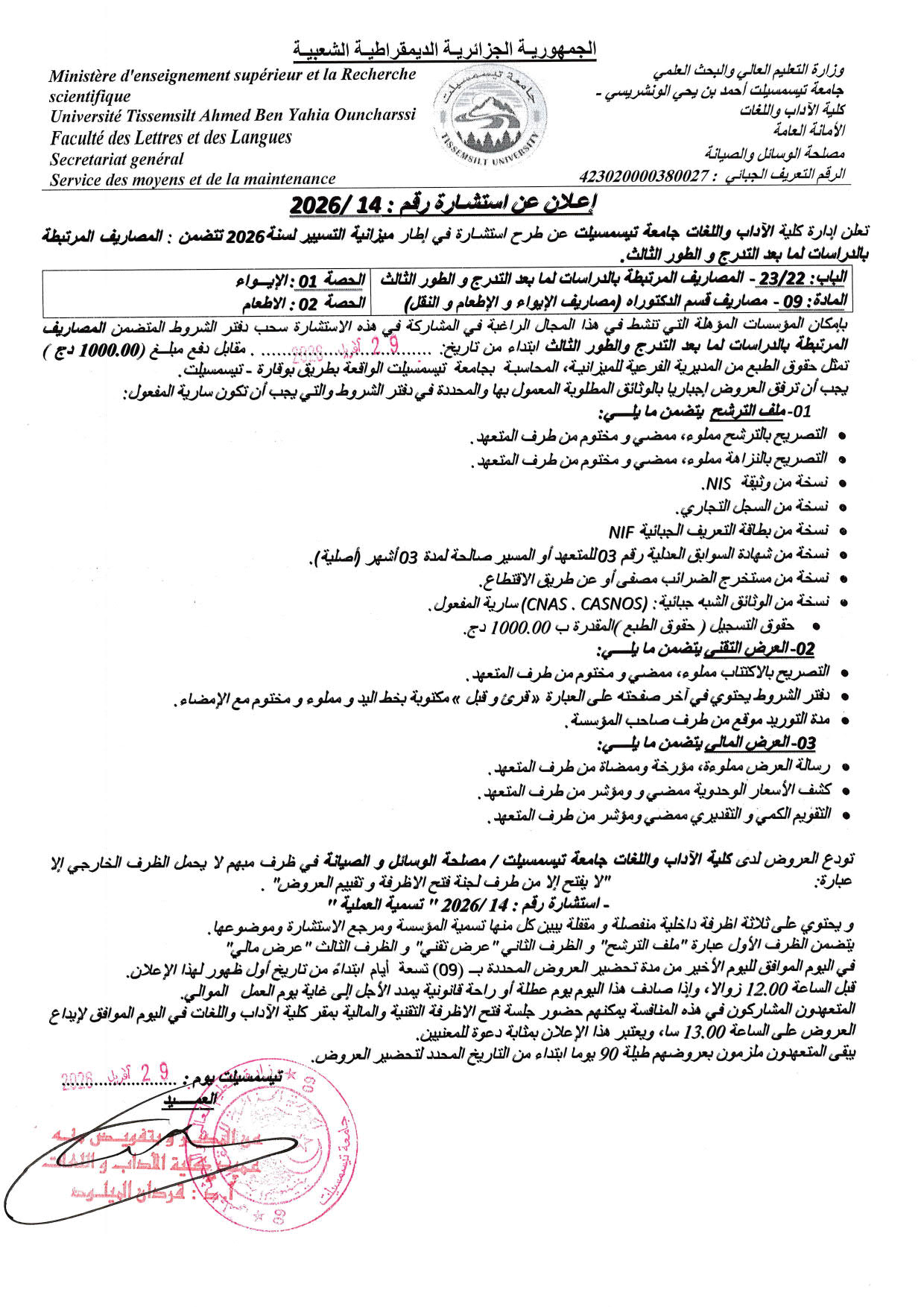 اعلان عن استشارة رقم: 11—2026/19 @إعلان عن مناقصات@التظاهرات العلمية و الثقافية بواسطة admin-ll آخر تحديث أبريل 30, 2026 3 شارك 3 شارك FacebookTwitterGoogle+ReddItWhatsAppPinterestالبريد الإلكتروني