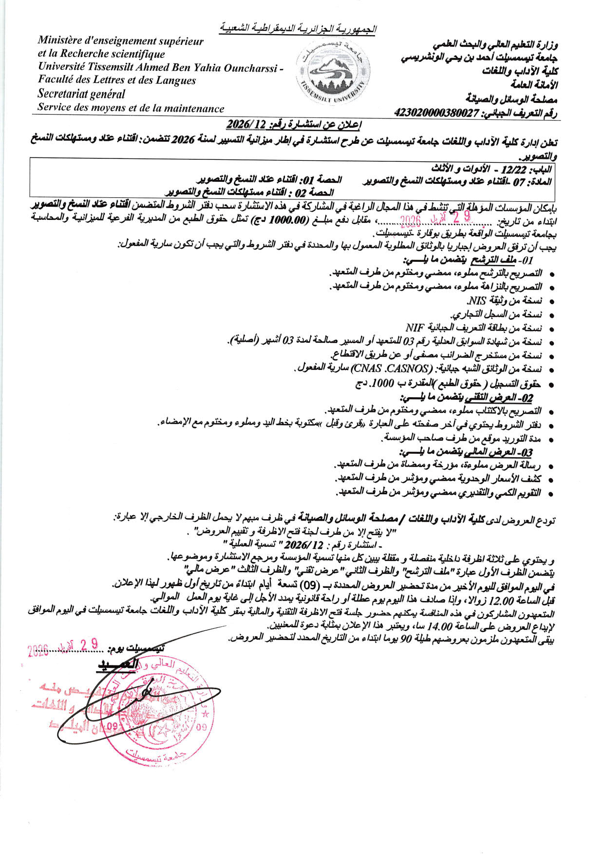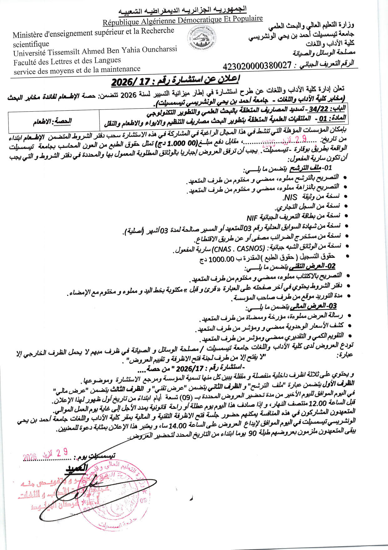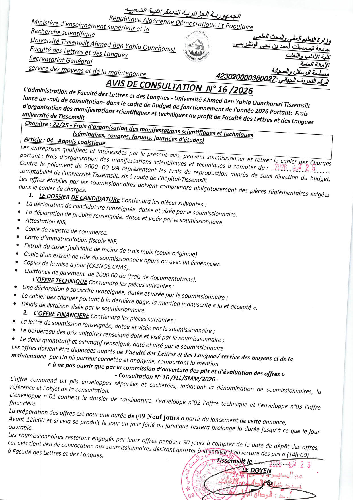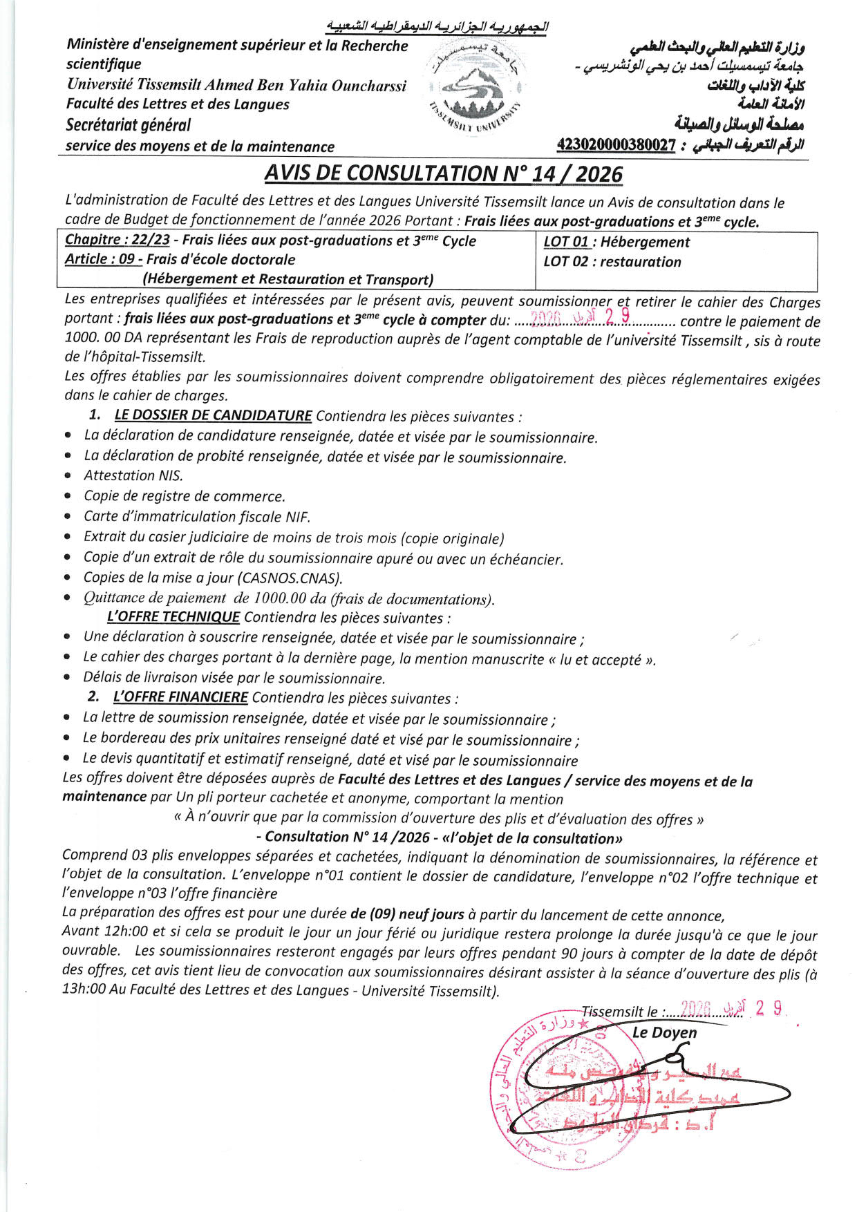 اعلان عن استشارة رقم: 11—2026/19 @إعلان عن مناقصات@التظاهرات العلمية و الثقافية بواسطة admin-ll آخر تحديث أبريل 30, 2026 3 شارك 3 شارك FacebookTwitterGoogle+ReddItWhatsAppPinterestالبريد الإلكتروني