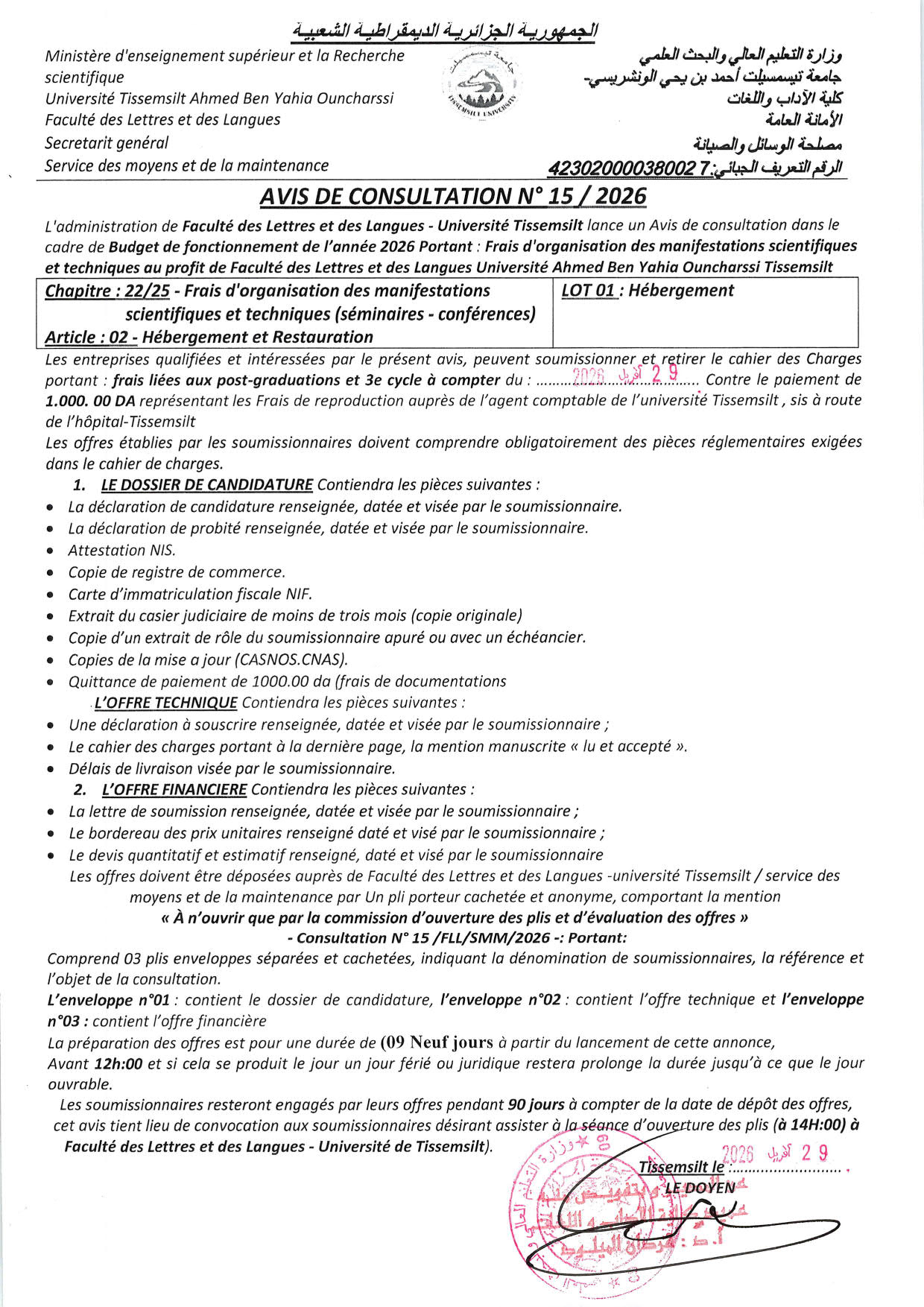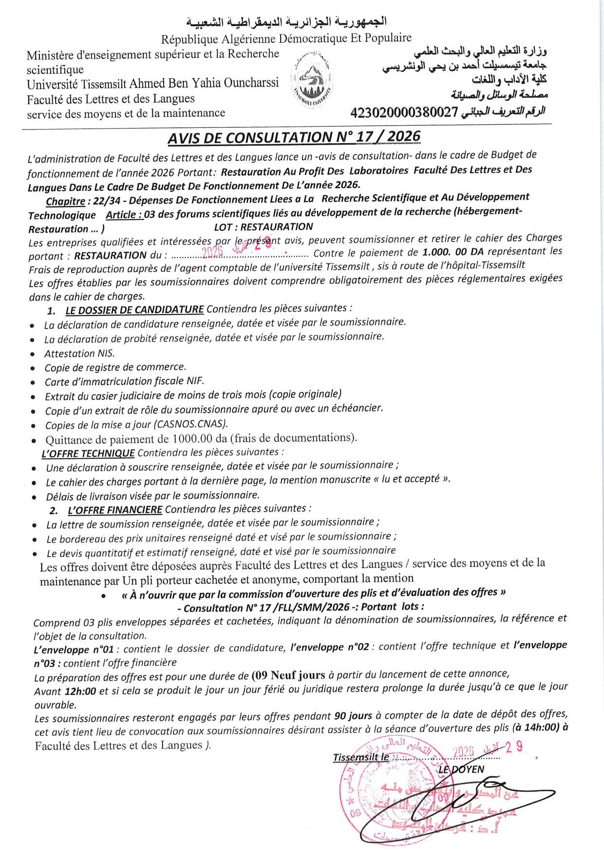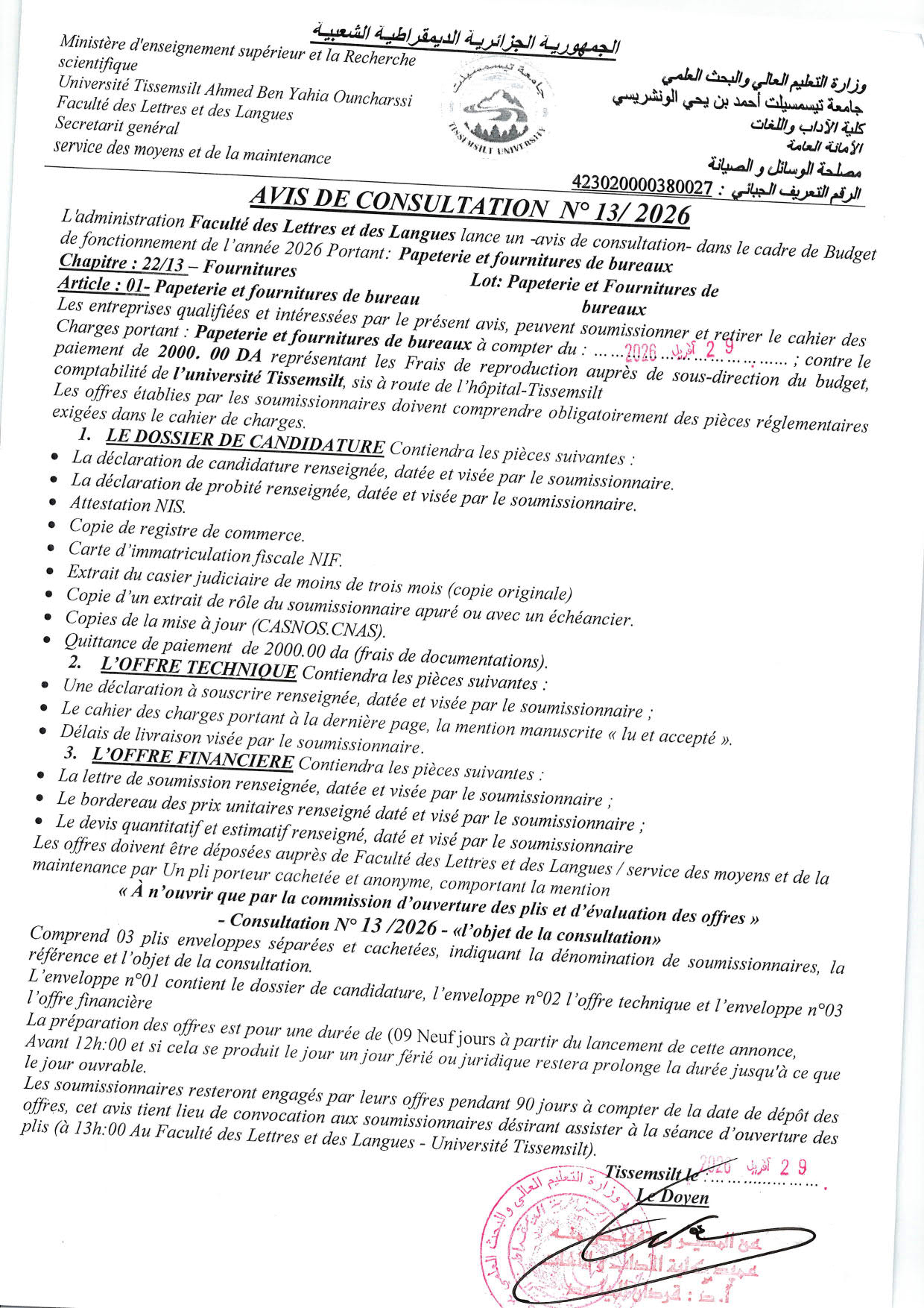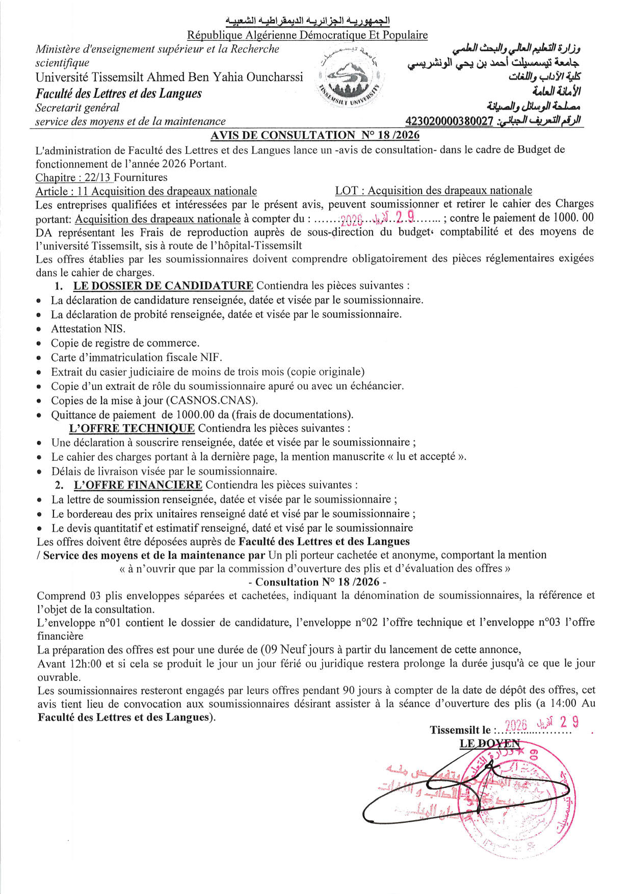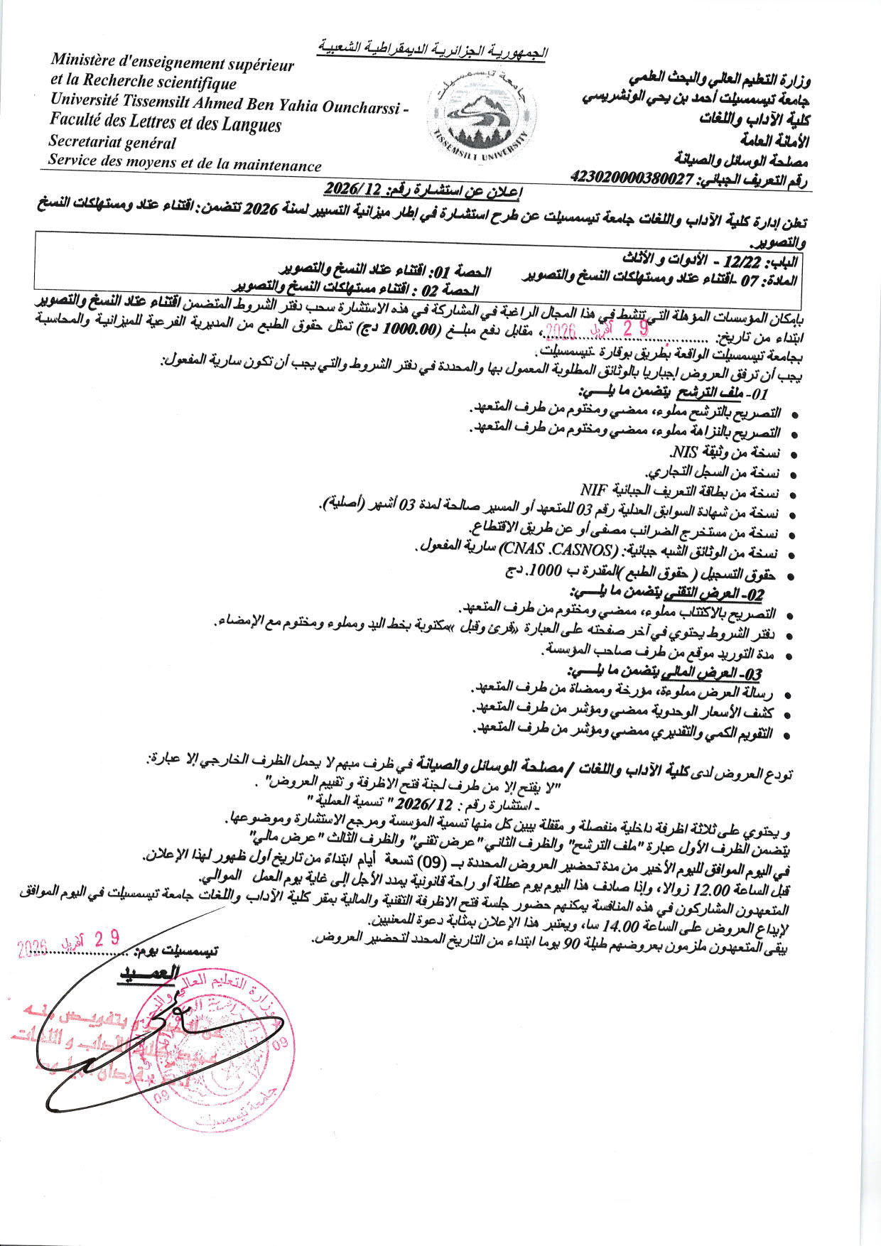 اعلان عن استشارة رقم: 11—2026/19 @إعلان عن مناقصات@التظاهرات العلمية و الثقافية بواسطة admin-ll آخر تحديث أبريل 30, 2026 3 شارك 3 شارك FacebookTwitterGoogle+ReddItWhatsAppPinterestالبريد الإلكتروني
